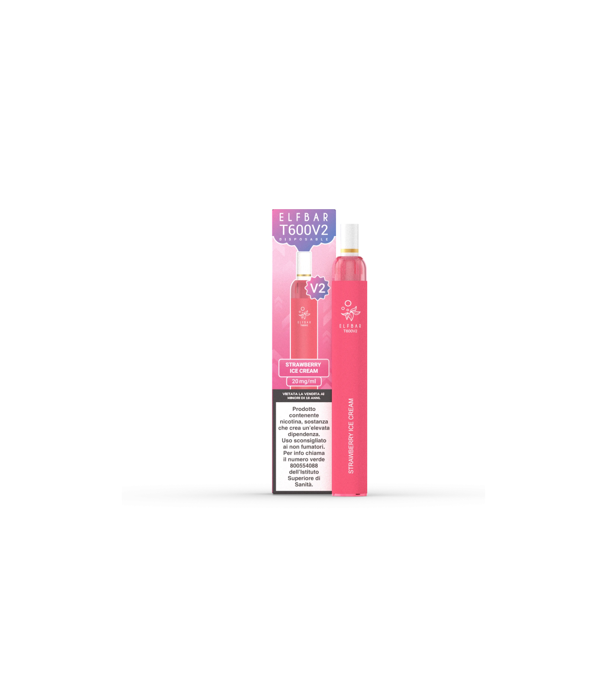 La Elf Bar T600 Strawberry Ice Cream è una e cig usa e getta per tiro di guancia (MTL) precaricata con 2ml di e-liquid a 20mg/ml sali di nicotina al gusto goloso di gelato alla fragola: un vero e proprio peccato di gola tutto da svapare.
